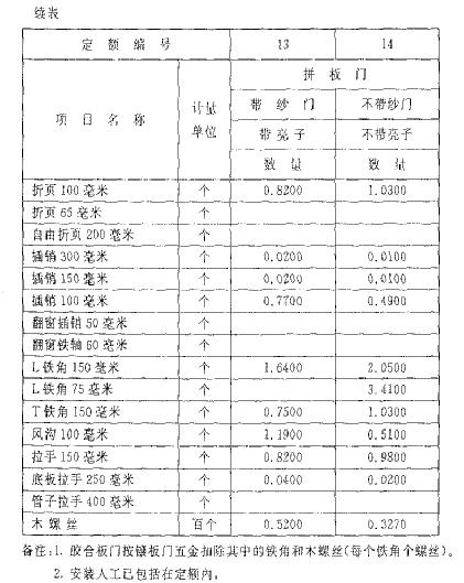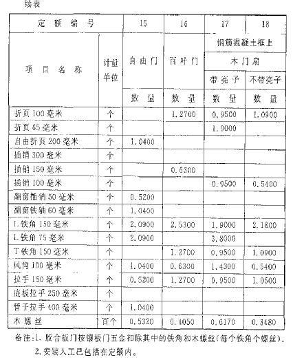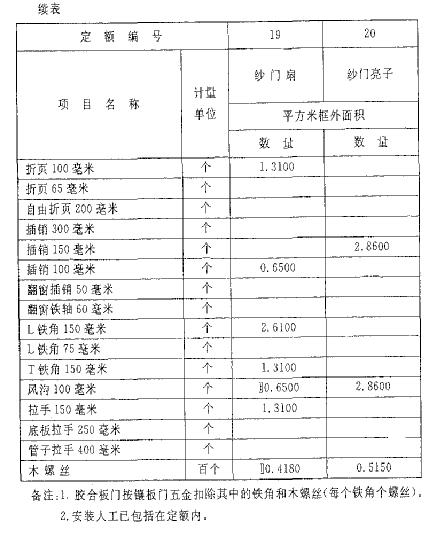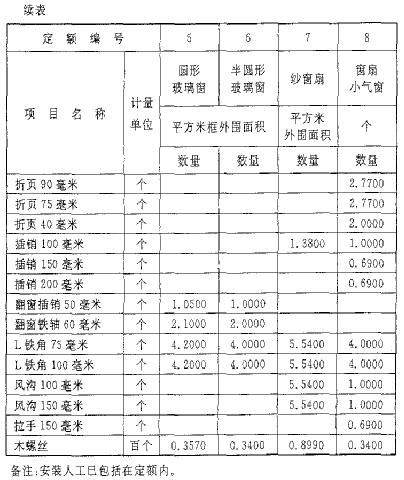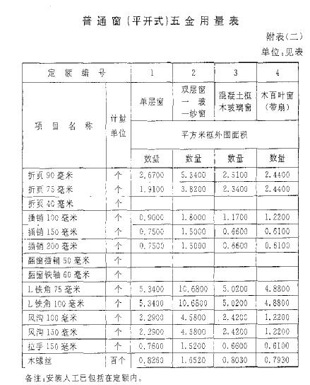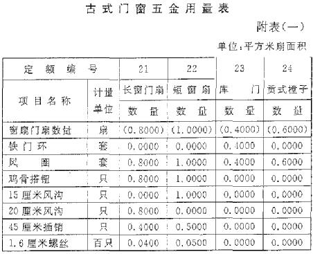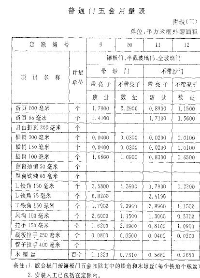 3 、本章定额中古式木门窗、普通木门窗定额中的小五金费,均已包括在定额子目内,如设计用小五金品种、数量不同时,可按附表(一)、(二)、(三)的规定调整。
