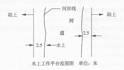 水上工作平台:凡从河道原有河岸线向陆地延伸2 . 5 米范围(见下图),均属水上工作平台。