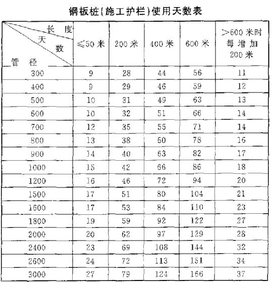 十、除设计另有规定外,槽型钢板桩使用天数,可按钢板桩使用天数表(附表)或施工合同中规定的安装施工工期计算同底双管同沟槽排管时,钢板桩使用天数可按第一章规则五计算沟槽宽度所对应的管径选取。不同口径连续排管时应按累计延长米计算钢板桩使用天数。