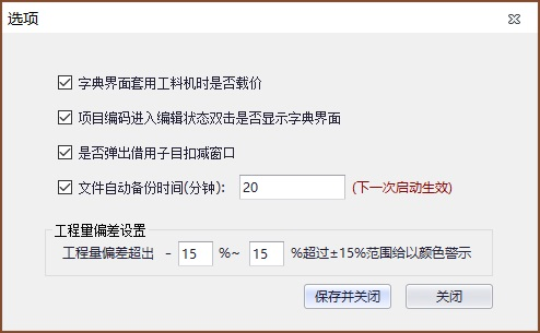 选项-设置:可勾选字典界面套用工料机时是否载价或项目编码进入编辑状态双击是否显示字典界面或是否弹出借用子目扣减窗口或文件自动备份时间