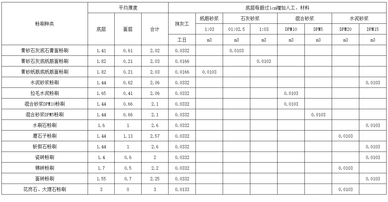 一、整体面层和块料面层砂浆平均厚度见附表,如刮糙层超过规定厚度,可参照“各类粉刷平均厚度和超厚递加表”进行换算。