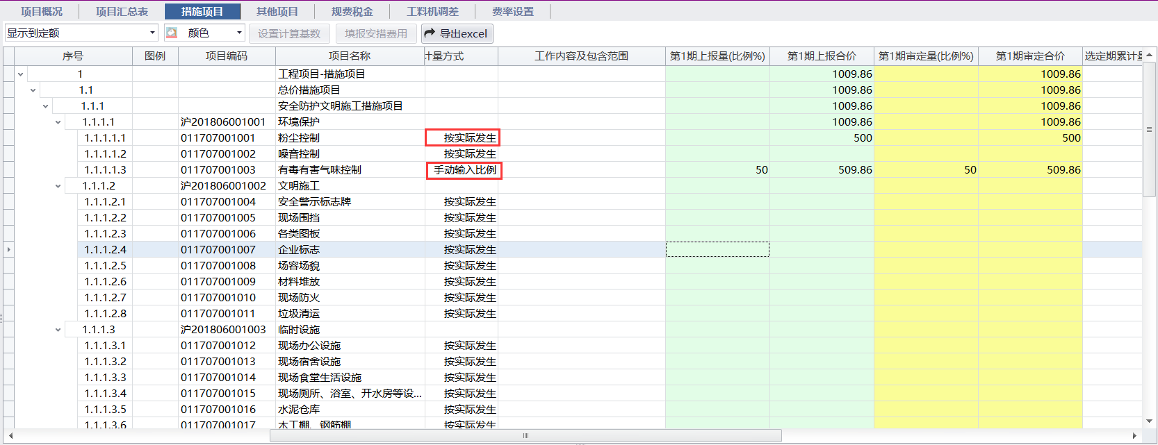 手动输入比例:手动输入当期总价措施完成的比例即可计算出上报合价