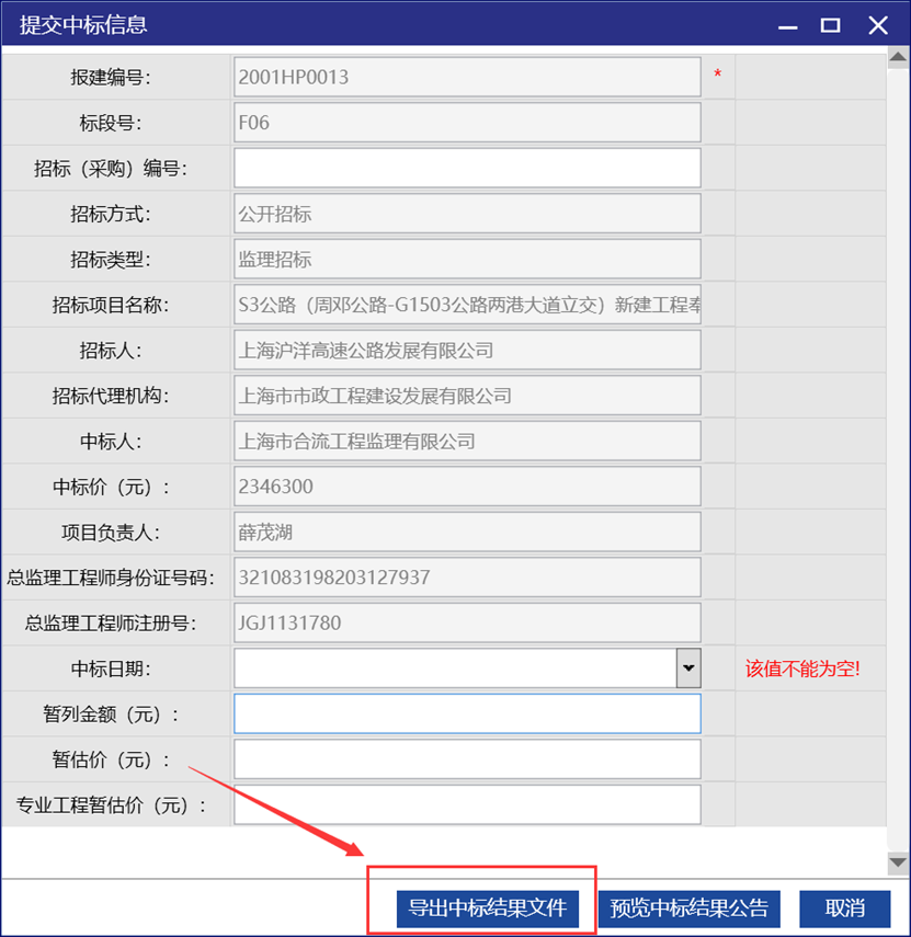 4.2.4点击确定后,在中标信息页面,补录其他信息后,选择【导出中标结果文件】