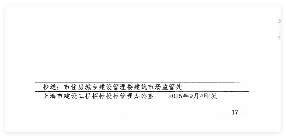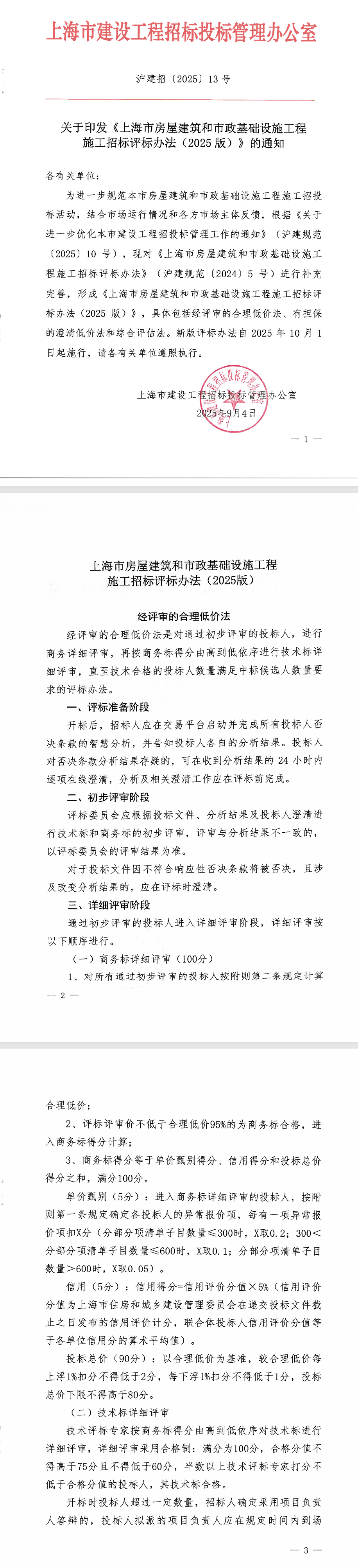 目录 搜索 政策法规国家法规中华人民共和国合同法中华人民共和国建筑法中华人民共和国招标投标法中华人民共和国招标投标法实施条例中华人民共和国电子签名法企业投资项目核准和备案管理条例行业规章关于印发建设工程质量保证金管理办法的通知(建质[2017]138号)建筑工程设计招标投标管理办法(住建部第33号令)机电产品国际招标代理机构监督管理办法(试行) (商务部5号令)关于在招标投标活动中全面开展行贿犯罪档案查询的通知(高检会[2015]3号 )关于印发《建筑工程五方责任主体项目负责人质量终身责任追究暂行办法》的通知(建质[2014]124号 机电产品国际招标投标实施办法(试行) (商务部令2014年第1号 )建筑工程施工发包与承包计价管理办法(建设部第16号令)电子招标投标办法(八部委20号令)中华人民共和国注册建筑师条例实施细则(建设部167号令)进一步规范机电产品国际招标投标活动有关规定(商产发[2007]395号 )注册造价工程师管理办法(建设部第150号令)注册建造师管理规定(建设部第153号令)注册监理工程师管理规定(建设部第147号令)工程建设项目货物招标投标办法(七部委27号令)工程建设项目招标投标活动投诉处理办法(七部委11号令)工程建设项目勘察设计招标投标办法(八部委2号令)工程建设项目施工招标投标办法(七部委30号令)评标专家和评标专家库管理暂行办法(计委29号令)国家重大建设项目招标投标监督暂行办法(计委18号令)评标委员会和评标方法暂行规定(七部委12号令)建设项目可行性研究报告增加招标内容以及核准招标事项暂行规定(计委9号令)房屋建筑和市政基础设施I程施工招标投标管理办法(建设部89号令)关于指定发布依法必须招标项目资格预审公告和招标公告的媒介的通知(计政策[2000] 868号)工程建设项目自行招标试行办法(计委5号令)招标公告发布暂行办法(计委4号令)工程建设项目招标范围和规模标准(计委3号令)上海地方法规上海市建设工程招标投标管理办法(沪府令50号)上海市政府投资项目稽察办法上海市建筑市场管理条例上海市设备监理管理办法上海市建筑玻璃幕墙管理办法上海市建设工程监理管理办法上海市建筑节能条例上海市安全生产条例上海市历史文化风貌区和优秀历史建筑保护条例上海市建设工程抗震设防管理办法上海市建设工程材料管理条例市建委规章沪建招〔2025〕13--关于印发《上海市房屋建筑和市政基础设施工程施工招标评标办法(2025版)》沪建规范〔2025〕10号《关于进一步优化本市建设工程招投标管理工作的通知》建设工程工程量清单计价标准2025上海市建设工程评标工作规范(2024版)沪建规范〔2024〕5号--上海市房屋建筑和市政基础设施工程施工招标评标办法(修)沪建规范〔2024〕6号 --关于修订印发《上海市建设项目工程总承包招标评标办法》的通知沪水务〔2024〕80 号--关于发布本市水利建设工程概算和预算相关费率的通知沪建标定〔2024〕84 号--关于调整本市城市基础设施养护维修工程规费项目设置及费用计算等相关事项的通知沪住修缮〔2023〕34号-关于调整本市住宅修缮工程投标过程中信用评价应用的通知(5)沪住修缮〔2023〕37号 -- 关于住宅修缮工程评标办法部分调整的通知沪住修缮〔2023〕26号关于规范本市住宅修缮工程设计成果质量要求的通知沪建标定联[2023]486号--关于发布本市建设工程概算相关费率的通知沪建招【2023】9号--关于明确本市建设工程招标投标交易范围等相关事项的通知沪建招【2023】8号--关于调整本市房屋建筑和市政工程施工招标涉及规费等相关事项的通知沪建招【2023】6号--关于在本市政府采购工程项目招标投标中预留份额面向中小企业的通知沪住修缮【2023】14号--关于调整住宅修缮工程招标投标中企业信用评价结果与资格预审条件的通知沪住修缮【2023】7号--关于完善本市旧住房更新改造工程招投标最高投标限价编制要求的通知沪住修缮【2023】2号--关于明确本市住宅修缮工程暂估价招标工作及有关资格预审条件的通知沪绿容工管【2023】15号--关于本市园林绿化建设工程招标投标落实沪绿容工管【2023】19 号--关于修订《关于在园林绿化工程招标投标中使用在沪园林绿化企业信用评价结果的通知》的通知沪财采【2023】11号--关于本市政府采购工程项目招标投标领域落实支持中小企业发展政策的通知沪建建管【2023】437 号--上海市住房和城乡建设管理委员会关于修订《上海市在沪建筑业企业信用评价标准( 2020 版)》和《关于在建设工程招标投标中使用在沪建业筑企业信用评价结果的通知》有关条款的通知沪建建管【2023】335号--在建设工程招标投标中应用在沪建设工程勘察设计企业信用评价结果的通知沪建标定联【2023】120号--关于调整本市建设工程规费项目设置等相关事项的通知沪住修缮【2022】1号--关于进一步加强本市旧住房更新改造工程市级项目改造科目及工程量管理的通知沪住修缮【2021】2号--关于明确《上海市住宅修缮工程施工招标评标办法》相关事项的通知沪住宅修缮【2021】7号--关于进一步加强本市住宅修缮工程招标代理机构管理的通知沪房规范【2020】3号--关于印发《上海市在沪住宅修缮企业信用评价实施细则》的通知沪住修缮【2020】23号--关于修订印发《上海市住宅修缮工程施工招标评标办法》的通知沪建建管【2020】139号: